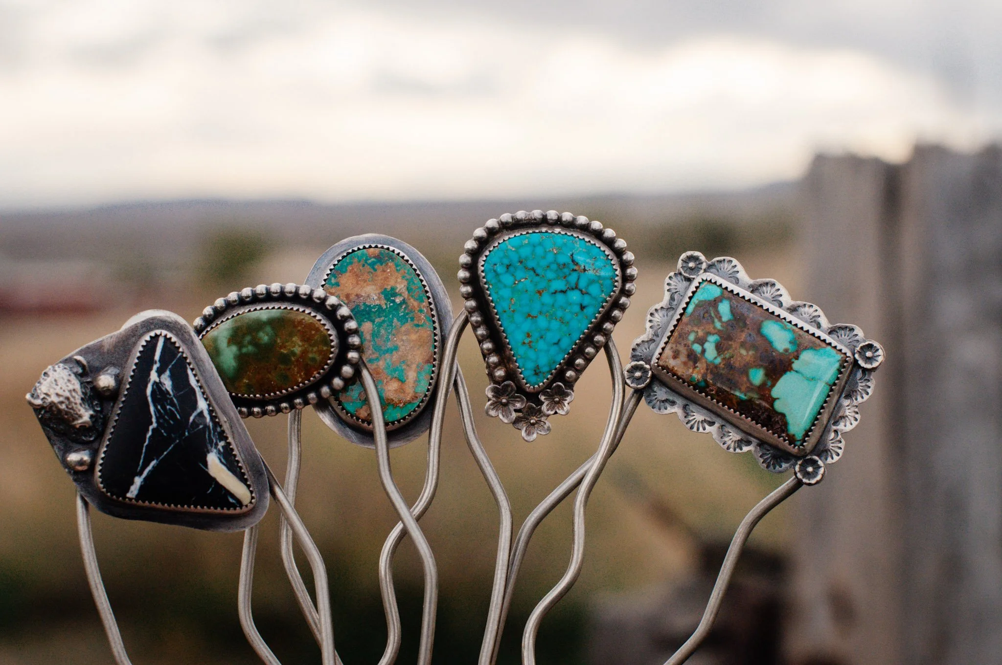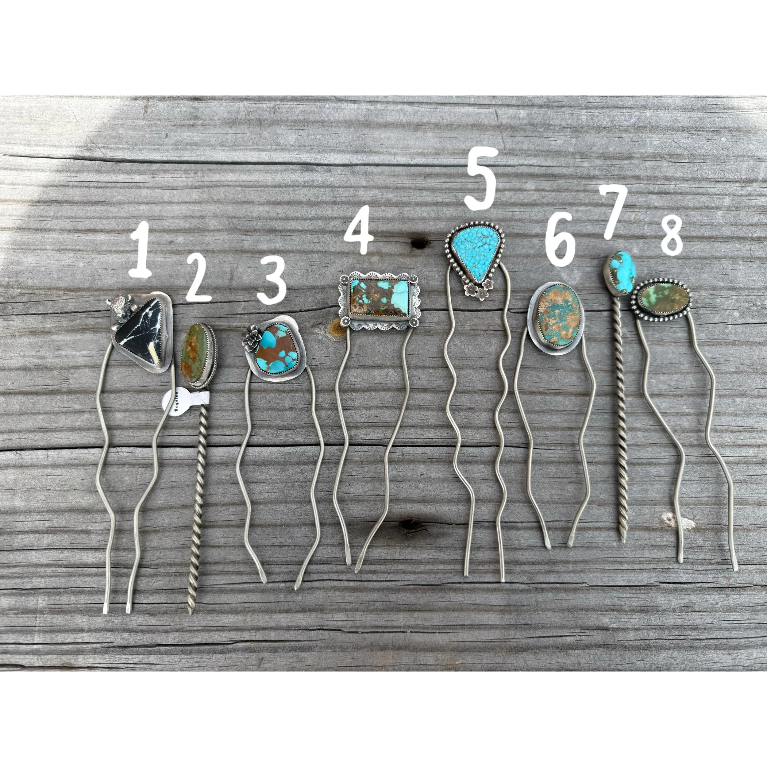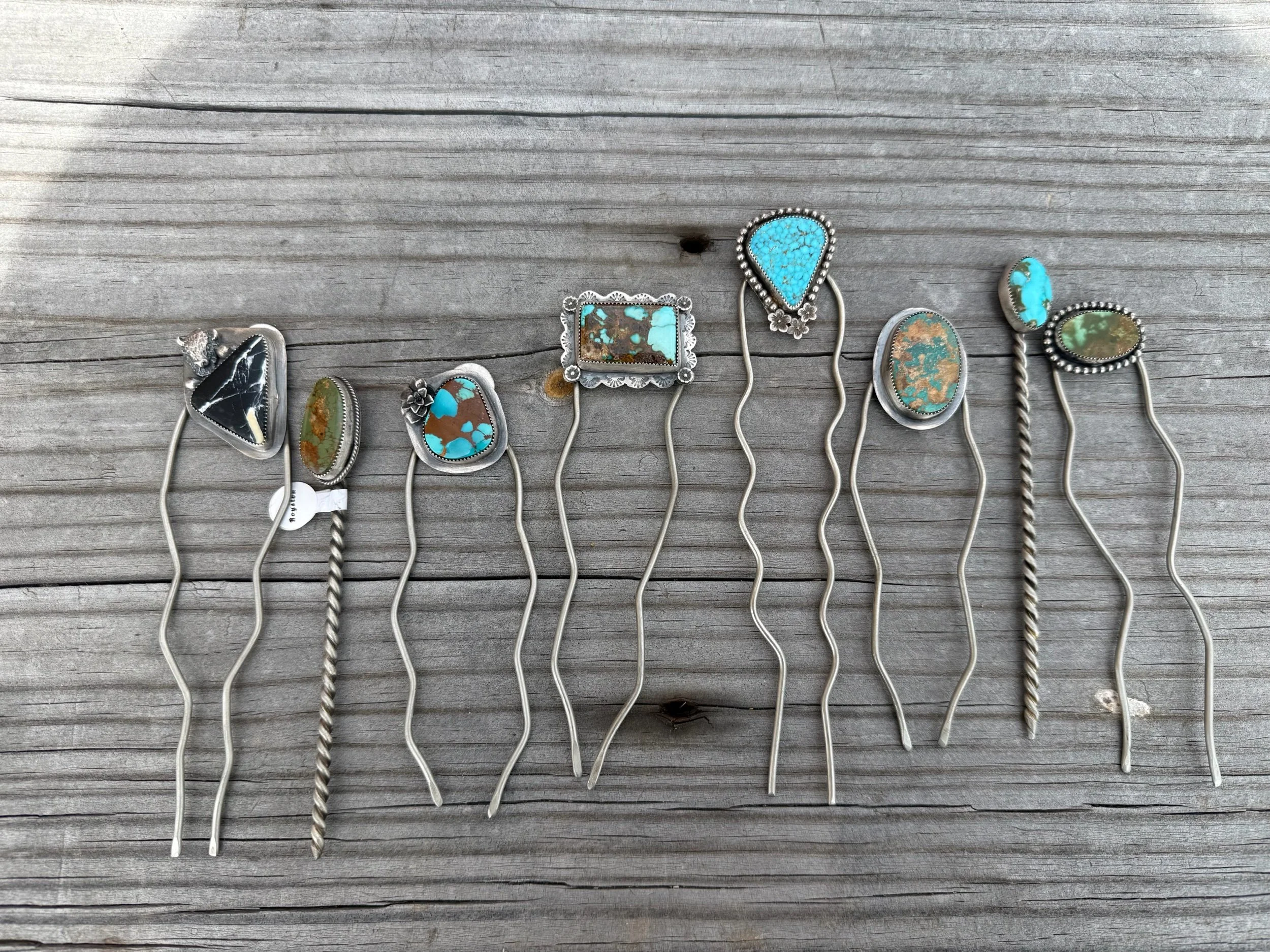 Shop › Hair forks & sticks Image 1 of 5 Image 2 of 5 Image 3 of 5 Image 4 of 5 Image 5 of 5 Hair forks & sticks from $195.00 These beauties are a mix metal. Setting all Sterling silver and the fork/stick is German silver for stability & strength. #: Select # #1 White Buffalo fork #2 pilot Mountain stick #3 Royston Fork #4 Royston Fork #5 Kingman fork #6 Sierra Bella fork #7 Sierra Bella stick Add To Cart Added! These beauties are a mix metal. Setting all Sterling silver and the fork/stick is German silver for stability & strength. Reviews Reviewer Name Review Date Star Rating Description Posted on Etsy Product Show More